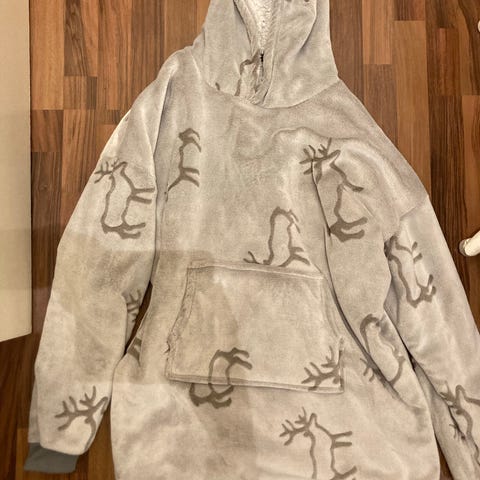 Huppari ja peitto samassa paketissa. Tämä iso huppari on pehmeä ja mukava syys- ja talvi-iltojen lämmittäjä. Materiaali: pehmeä fleece, polyesteri. Sisällä pehmoinen teddyvuori. Yksi koko. Selän pituus niskasta helmaan 90 cm. Kissan kynnet jääneet muutamaan kohtaan kiinni, siitä kuva. Muuten hyväkuntoinen ja todella lämmin.