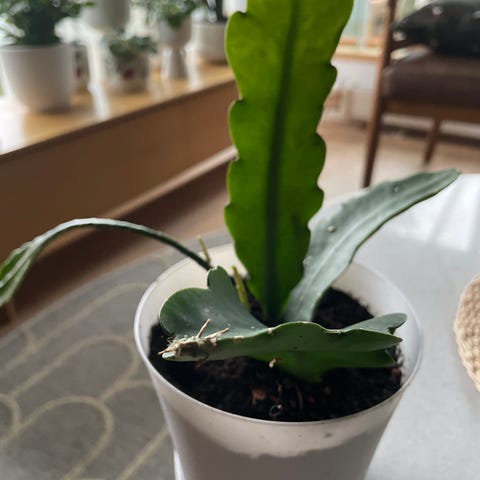 *Lehtikaktus 'Sarah Courant' Epiphyllum, myös kasvin tuotekortti löytyi mukaan jossa on hoito-ohjeet. Lehdillä pituutta 30-23cm on mustassa 12cm ruukussa, valkea suojaruukku ei kuulu mukaan.