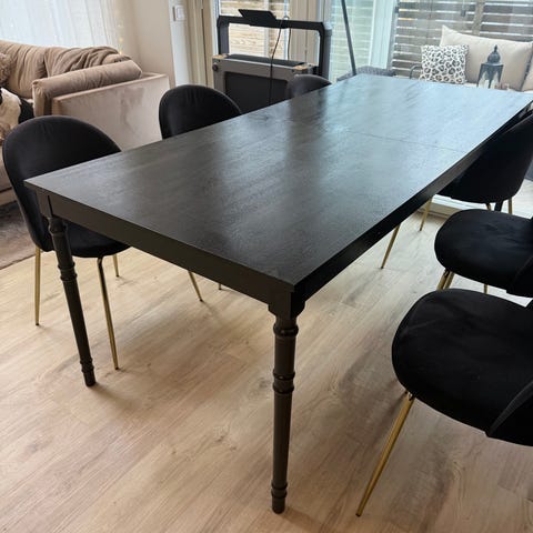 Jykevä kuuden hengen ruokapöytä, pari kuprua pinnassa ja reunassa kulumaa, näistä kuvat. Ilmeisesti runko jykevää täyttä puuta.