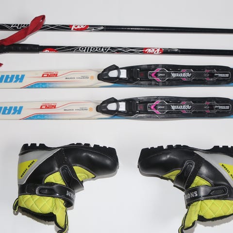 120 cm suksissa kinnitys perinteisille kengille. Mukana myös sauvat