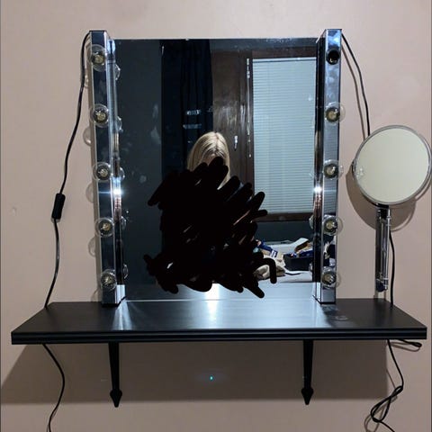 Meikkipeili jossa himmennettävät lämpimänvalkoiset LED valot. Voi ripustaa seinälle tai asettaa pystyyn pöydälle.