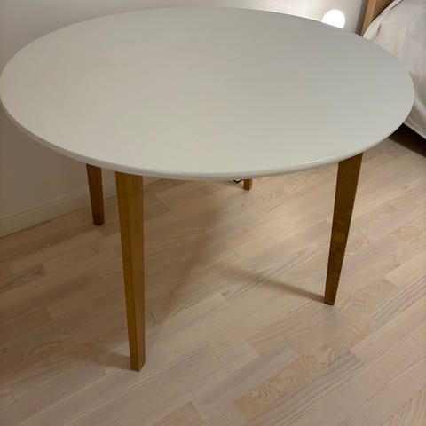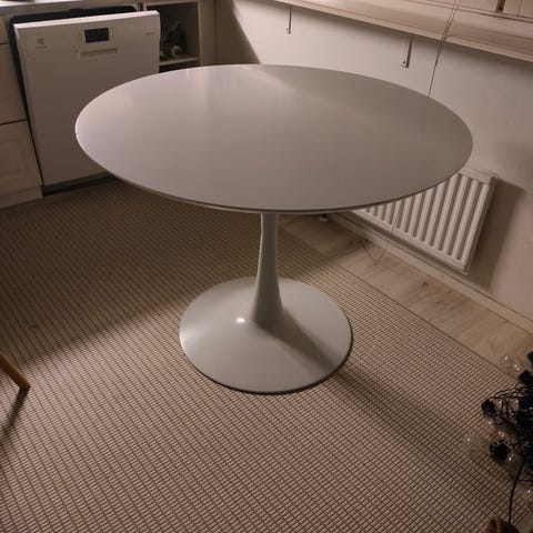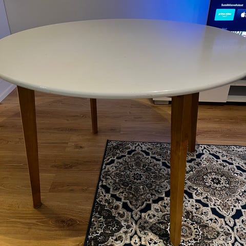 Veken valkoinen pyöreä ruokapöytä. Muuten hyvässä kunnossa, mutta kannessa muutamia jälkiä, joista on kuva. Jalat ovat puulta näyttävää metallia.