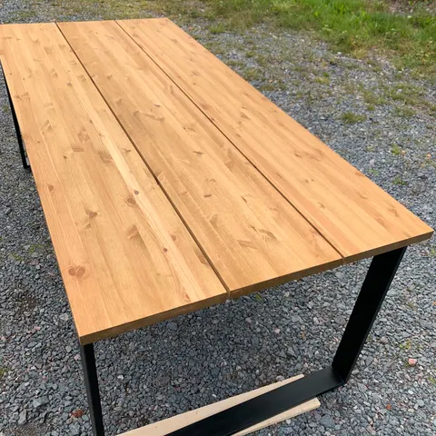 Lehtikuusesta tehty lankkupöytä. Jalat metallia. Lankun paksuus 7cm joten on massiivinen ja varaa höylätä puhtaaksi! Tällä hetkellä osmocolorin kirkas öljy pinnassa.