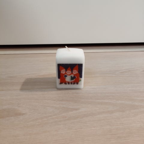 Myydään kynttilä ja teline sekä kaksi tonttua.