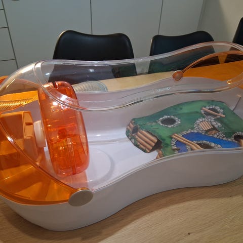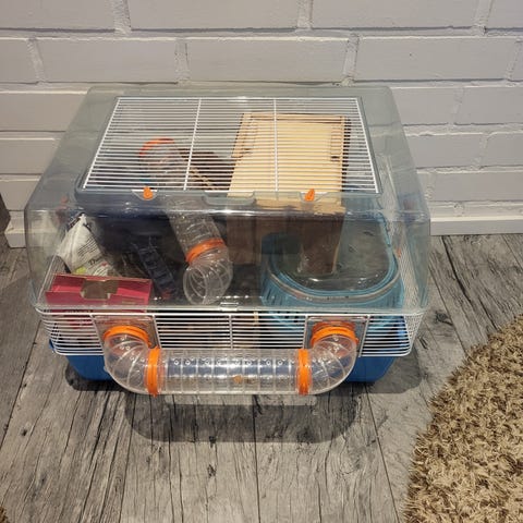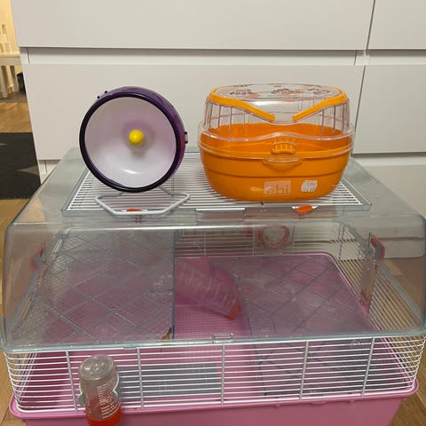 Jyrsijän häkki, ollut hamsterin kotina. Leveys 1m. Mukaan juoksupyörä, juomapullo sekä kuvassa näkyvät puiset sisusteet. Nouto espoosta.