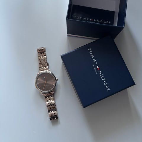Vähälle käytölle jäänyt Tommy Hilfigerin kultainen rannekello. Alkuperäinen laatikko ja lisäosat mukana. Paristojen vaihto jää ostajalle.