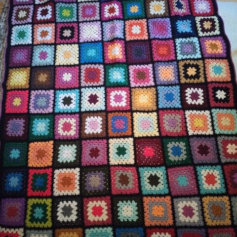 Myydään isoäidinneliöistä virkattu peitto. Tehty puuvillalangasta.