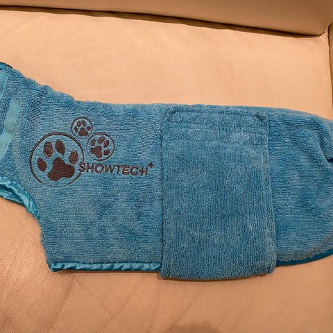 Myydään hyvä kuntoinen koiran kietaisupyyhe. Showtech, koko XL. Selkäpituus 77 cm + kaulus n 23cm. Käytetty isolla uros kultaisellanoutajalla.