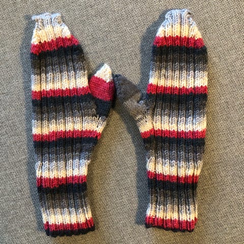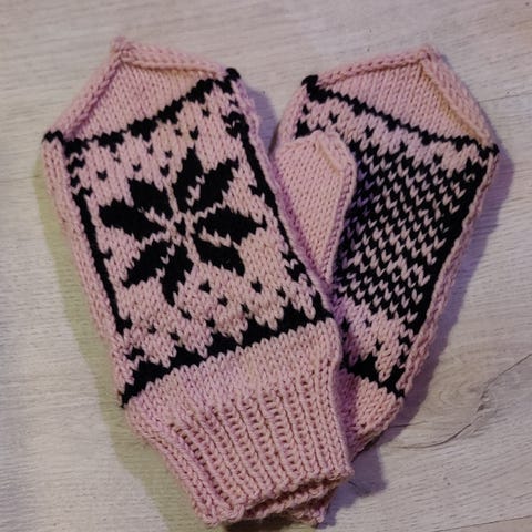 Käyttämättömät, käsintehdyt pitkävartiset lapaset glitter-/paljettikoristeilla. Lapasissa melko pitkä "sormiosa" (pituus peukalonhangasta kärkeen n. 15 cm).