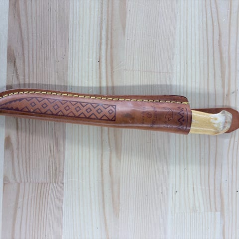 Todella hieno puukko ja tyylikäs tuppi. Hyväkuntoinen. Terässä pientä naarmua. Hopeaosia ei ole kiillotettu.