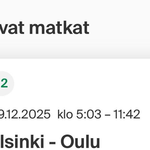 VR IC 27 junalippu aikataululla Helsinki 14:20 lähtö ja Oulu 20:12 saapuminen. Vaunu 2, yläkerta, istumapaikka 75 ikkunan vieressä, EXTRA luokka.