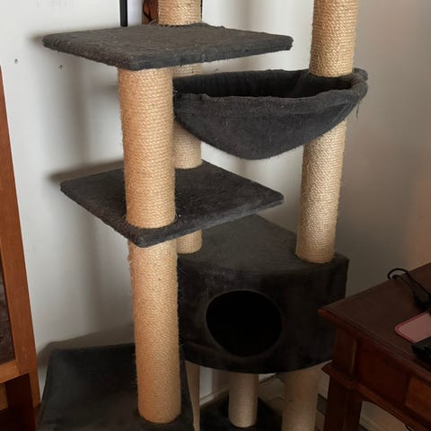 Ok kuntoinen korkea, vakaa, tilaa säästävä raapimispuu. Katso kunto kuvista. Viimeisten kuvien mukaiset osat. Meillä ollut käytössä matalampana versiona, kuvat. Kaikki viimeisen kuvan osat kuitenkin mukaan.