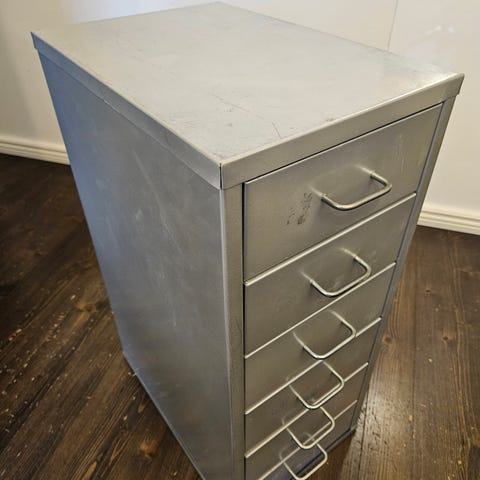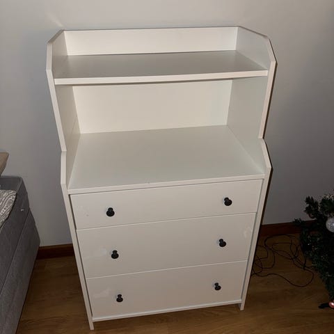 Valkoinen laatikosto. Hieman kulumia, muutoin hyvässä kunnossa. Haku paikan päältä.