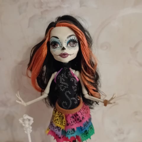Hyväkuntoinen Monster High nukke kuvan asussa, siivet selässä, mukaan teline ja lemmikki. Keräilijän kokoelmasta.