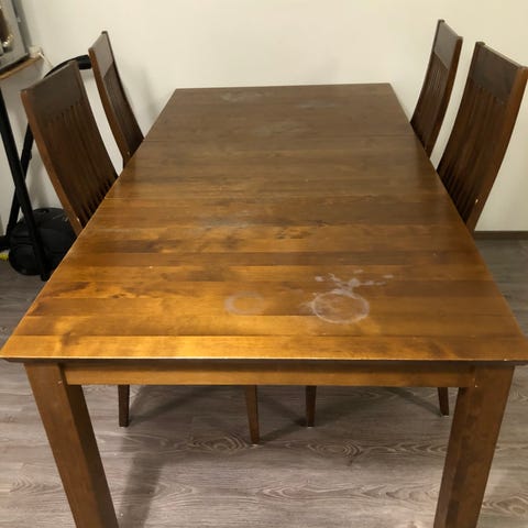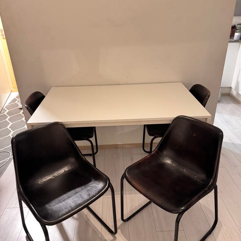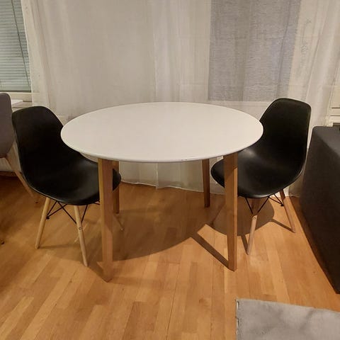 Pöytä ja kaksi tuolia. Pöydässä kulumaa, penkit hyvät. Lisäkuvia pyydettäessä. Sopii neljälle, meillä ollut vain kahden tuolin kanssa. Pehmusteet ei tuolien omat, ikean yleismallit.