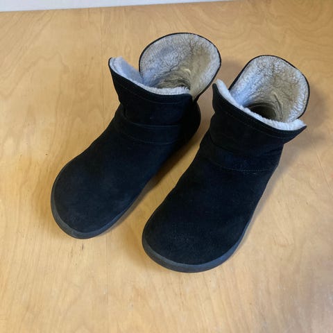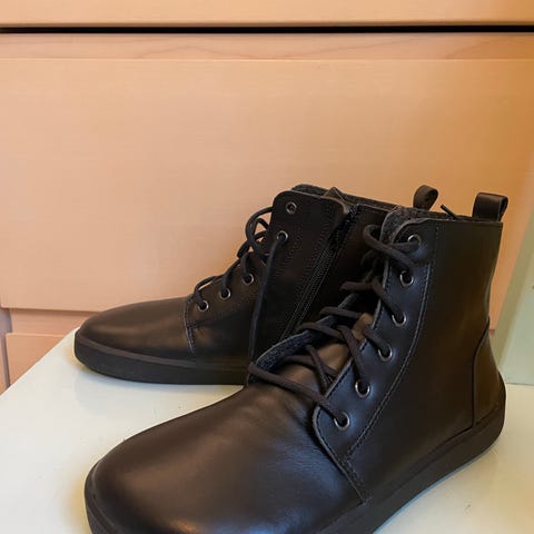 Hyväkuntoiset, uutena ostetut paljasjalkakengät. Sopii välikauteen tai esim.villasukan kanssa leutoon talvikeliin. Nahkakengät fleece-vuorella, pohja tpa-kumia. Kaksi pientä nirhaumaa / naarmua, joista kuvat. Toisen kengän sisällä takaosassa / pohjassa kuluma vuoressa, josta kuva.