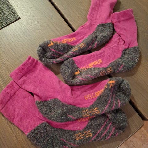 Siisti käytetyt Villapohja sukat. Koko 32-35. Pohjaosa villaa, muuten urheilusukka mallinen. Ehjät ja pehmeät, ei kovaksi huopuneet. 3 paria.