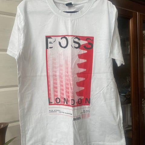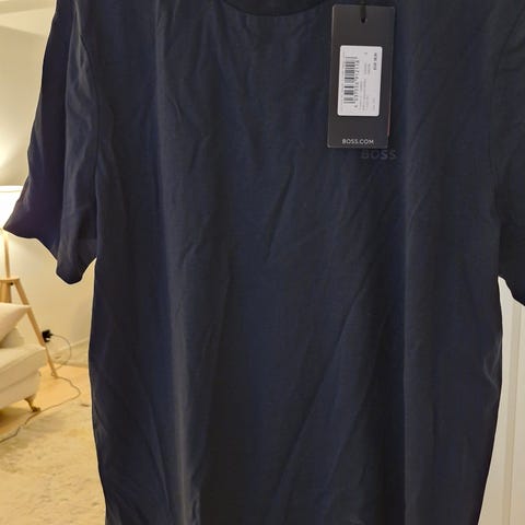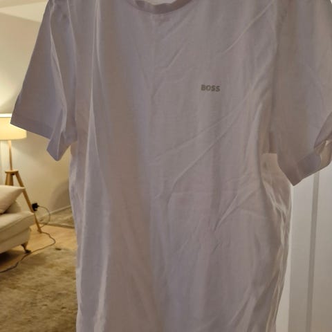 Tosi pehmeä ja hyväkuntoinen Hugo Bossin valkoinen T-paita, koko L. En näe moitetta. Materiaalilappu uupuu, mutta oletan olevan täysin tai melkein täysin puuvillaa.