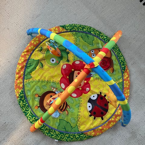 Vauvalle leikki matto. Leikkimaton kaaren kiinnityksiä on useampi, pari on irronnut, mutta ei haittaa käyttöä mitenkään. Eli kaaret saa kyllä kiinni joka tapauksessa. Maton alla on tarrat jotka pitää matossa kiinni ettei lähde luisumaa, ovat aika loppuun käytetyn näköiset, mutta meillä ainakin on kiinnittynyt vielä hyvin mattoon. Muuten on tosi siistin näköinen sekä ehjä, paitsi pohja joka on lattiaa vasten niin siellä nukkaa tosi paljon.