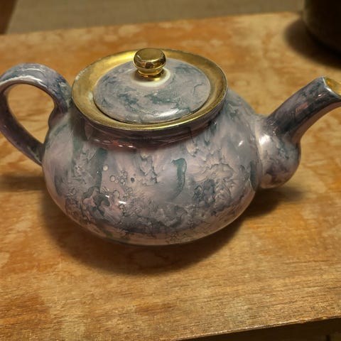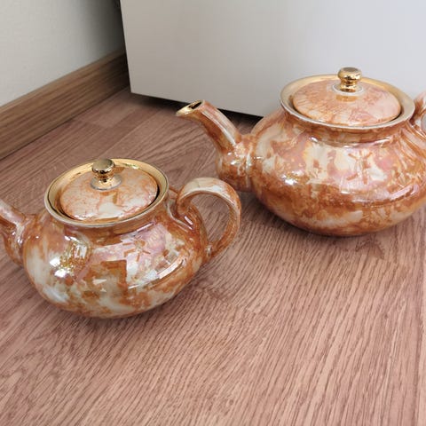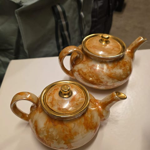 Myynnissä Arabian Kirjo-teekannusetti, toinen isompi (vedelle) toinen pienempi (teelle).