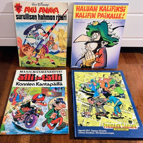 Keräilijälle wanhat sarjikset: Tom ja Tom 4 Toarin herääminen, Kippari-Kalle ja Lännentie. Muut kuvien sarjikset jo myyty.Myynnissä Lohjalla, mutta kulkeutuvat ilman postimaksua omien menojen mukaan Kamppiin ja Espoon Ikealle. Myynnissä myös muualla. Hp. 5 euroa/kpl.