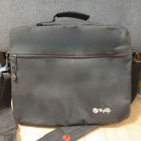 Vanha, mutta täysin ehjä ja siisti läppärilaukku. Merkkiä en saanut selville. Voin mitata tarvittaessa. Normikokoinen läppäri sopii hyvin ja muita tarvikkeita. Paljon taskuja.