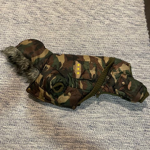 Punainen koiran toppahaalari, koko S. Haalarissa on hupullinen muotoilu ja aukot etujaloille, takana resorilliset puntit. Materiaali polyesteriä, kevyttä mutta lämmintä. Sopii pienikokoiselle koiralle. Kuin uusi. Ihana karvainen huppu ja helposti kiinnitettävät napit. Selän pituus n.23 cm.