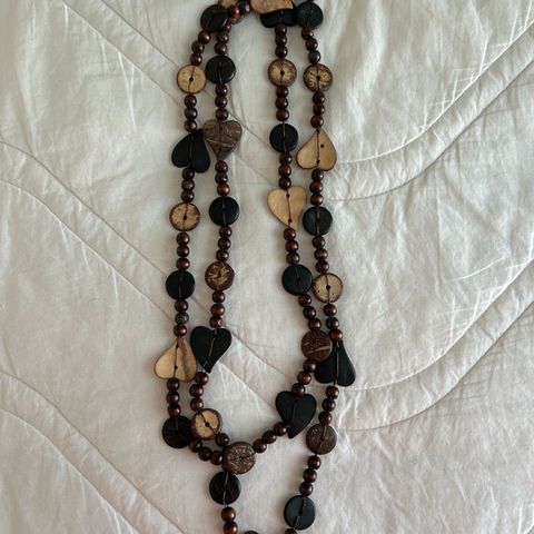 Puu / puiset helmet on rouheita ja rustiikkisia ja välissä messingin värisiä helmiä.