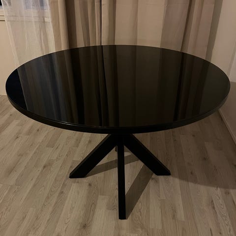 Pöytään teetetty komea lasilevy, jonka halkaisija 96cm.
