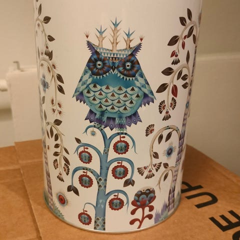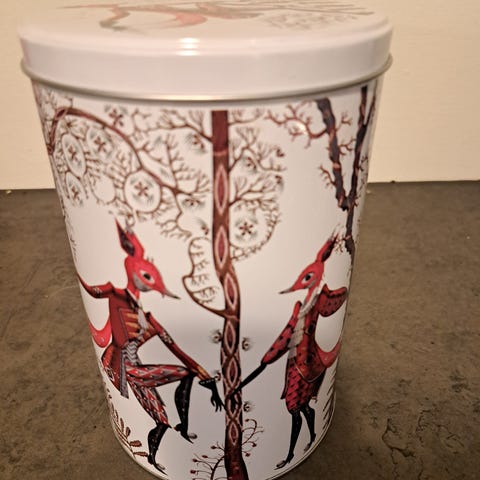 Iittala Tanssi peltipurkki. Käytetty kahvipurkkina, on lusikan jälkiä kannessa ja pohjassa, näkyvät kuvissa.
