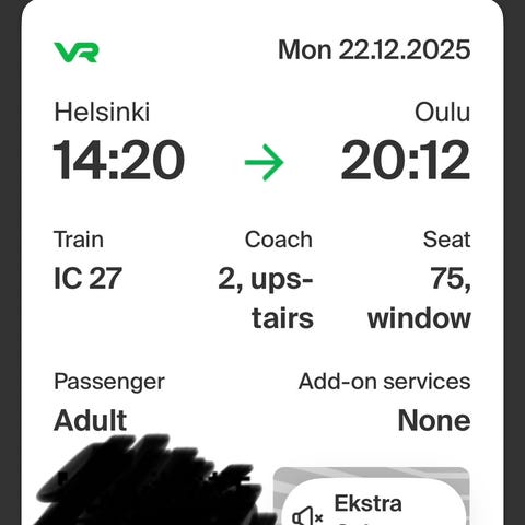 VR Junalippu Jyväskylästä Helsinkiin 29.12.2025