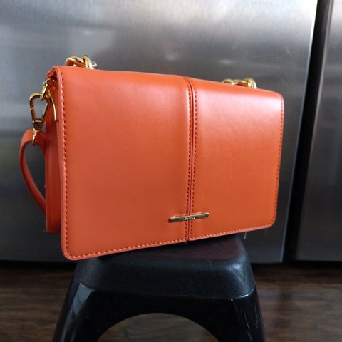 Laukussa on magneettinappisuljenta, sisällä vetoketjullinen pikkutasku ja kaksi pienempää taskua. Laukku on käyttämätön.
