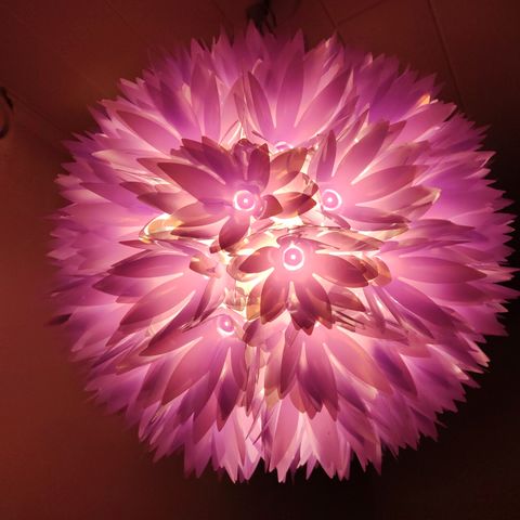 Upea korkea lotus valaisin, n. 2m, kolmella eri valosäädöllä, lotuksen kukat pinkin/korallin väriset, kultaisilla yksityiskohdilla, valkoinen runko. Vanhaa vintagea.