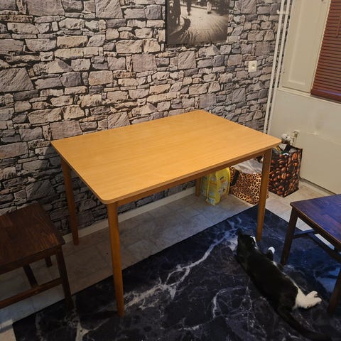 Kunto siisti, pöydän ruuvit kaipaa kiristystä. Jatkopalan mekanismi toimii.
