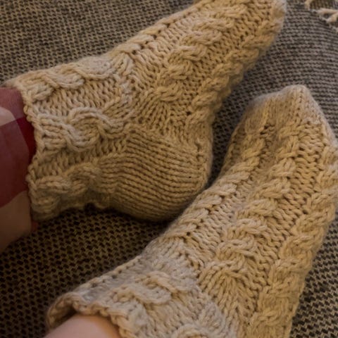 Vihreät käsinneulotut villasukat, jotka ovat 100% villaa.