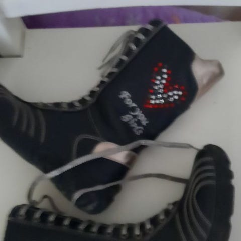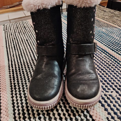 Ihanat sydänkuivioiset pikkutytön mustat talvisaappaat. Koko 29. Varressa koko varren pituudelta ommeltuja sydänkuvioita. Jalkaterän päällä vinosti ommeltu remmi, jonka sivulla kullanvärinen sydänsolki. Sydänkuviointi jatkuu pohjassa. Noin 1 cm korko. Musta tekoturkisvuoraus. Sisäsivulla vetoketjukiinnitys. Sekä päältä että pohjista uudennäköisessä kunnossa. Yhden tytön parempina jalkineina käyttämät. Myynnissä Lohjalla, mutta kulkeutuvat ilman postimaksua omien menojen mukaan Kamppiin, Espoon Ikealle tai Espoon keskukseen.