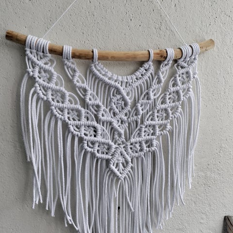 Uusi, kaunis luonnonvalkoinen macramekuusi puuhelmillä.