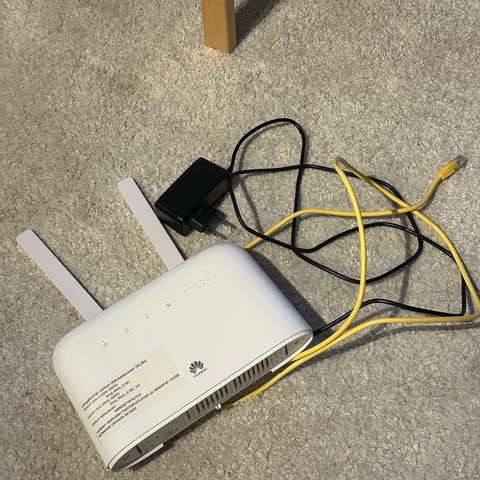 Valkoinen reititin. Tarkka malli B525s-23a. Mukana virtalähde, ohjekirja ja verkkopiuha.