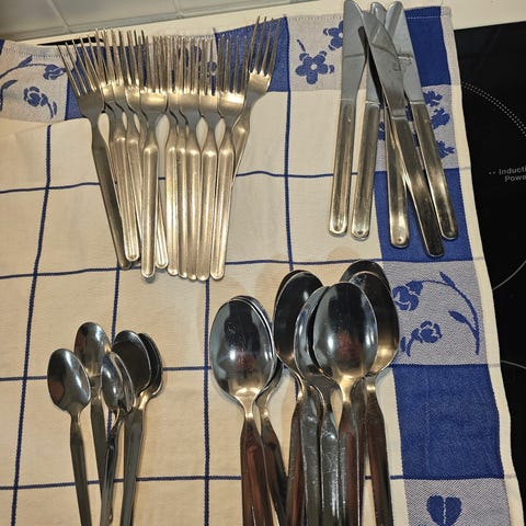 Muuton alta myyntiin hyväkuntoiset ja kestävät ruokailuvälineet: 5 ruokalusikkaa, 6 -haarukkaa, 5 -veitseä ja 6 pikkulusikkaa. Ruostumatonta terästä, jykevät.