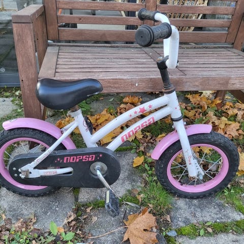 Käyttämätön Jupiter Sweetie lasten polkupyörä, 12 tuuman renkailla. Polkupyörässä on irroitettavat apupyörät ja takana ohjaustanko vanhempien ohjaukseen. Varustettu valkoisella etukorilla ja violeteilla lokasuojilla.