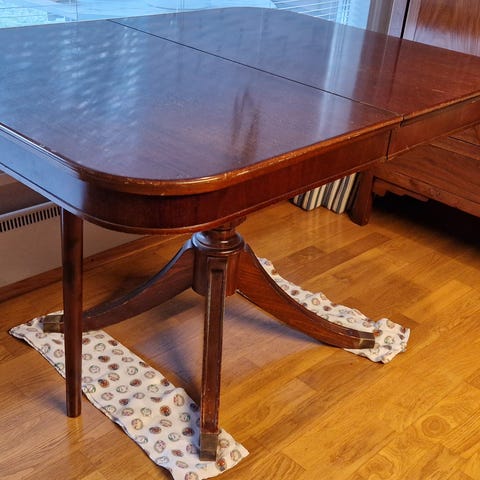 Yksi pöytälevyn laudoista on irti yhdestä reunasta. Pöytälevyssä on myös yksi vaalea naarmu. Yleisvaikutelma hyvä.