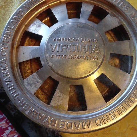 Vintake tuhkakuppi 1950 luvulta, valettua messinkiä valmistettu Tampereella. Mitat 10 x 14,5 cm.