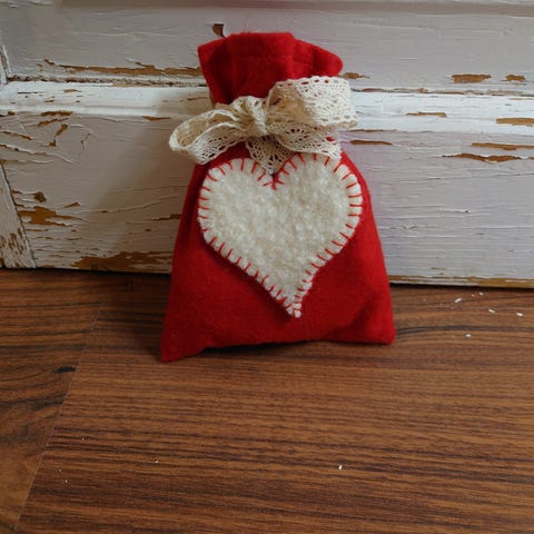Lahjapussukka säkkikankaasta, sisällä puuvillakangas vuori. Virkattu kukka koristeena. Koko n. Kokonaiskorkeus. 19 cm, pussukkaosa n. 16x 16 cm.