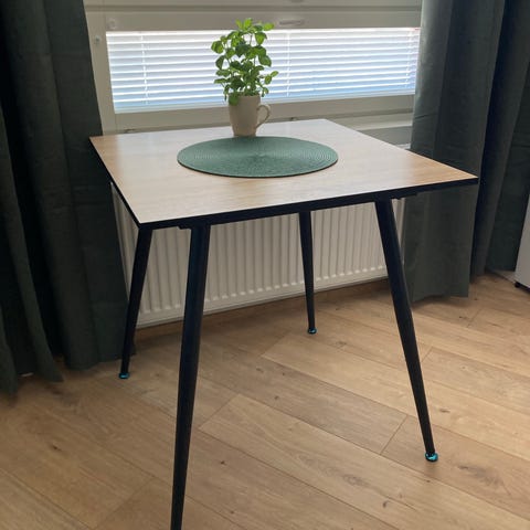 Myydään valkoinen 4hengen ruokapöytä. Pinnassa näkyy joitain pieniä käytönjälkiä, maali lähtenyt pienesti (kuva)