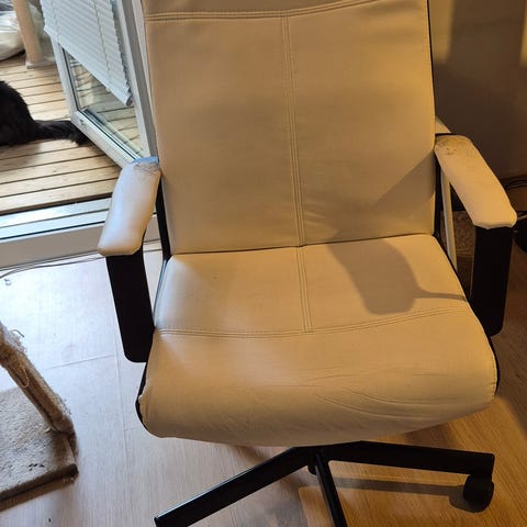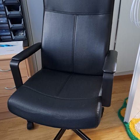 Mekaanisesti hyväkuntoinen Ikean työtuoli seuraavalle omistajalle pois uuden alta. Keinonahkainen verhoilu on hieman kärsinyt kuten kuvista näkyy. Istuimen korkeus ja kallistuskulma ovat säädettävissä.