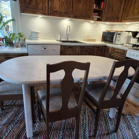Todella siisti puinen jatkopöytä, jatko palan saa keskeltä pois joka on 42cm jolloin pöytä on 133cm pitkä. Myös 6kpl kuvan tuoleja. Tuolit ja pöytä todella tukevia. Pöydässä ei naarmuja, ollut aina liina päällä.