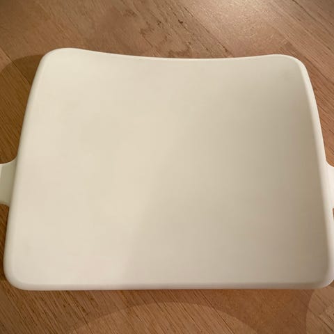 Stokke syöttötuoliin selkänoja. Ehjä, mutta väri tummentunut uudesta, yläosassa jotain keltaista myös, ei lähtenyt pyyhkimällä.