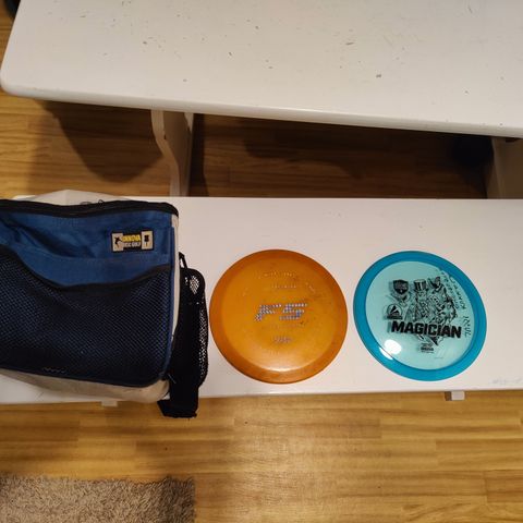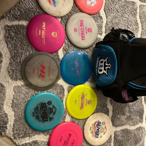 osa kiekoista on kuin uusia ja osa jonkin verran käytettyjä repussa on käytön jälkiä vähäsen