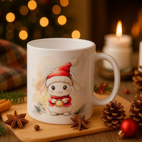 Luo kotiisi lämmin ja tunnelmallinen joulutunnelma tällä hurmaavalla joulumukilla. Mukia koristaa suloinen jänis punaisessa mekossa, kädessään höyryävä kuppi – täydellinen kuva talven rauhallisista hetkistä. Pehmeät värit ja satumainen kuvitus tekevät mukista ihanan katseenvangitsijan niin arkeen kuin juhlaan.
