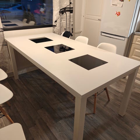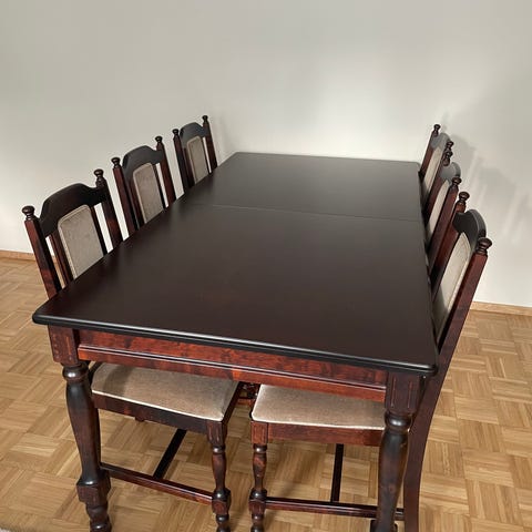 Kuuden hengen ruokapöytä. Vähäisiä käytön jälkiä.